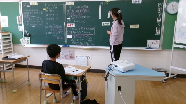これまでの授業をしっかりと振り返ってから、今日の授業が始まりました。ここでは3けたの足し算の問題をやっています。どうしてこういう式になったのかを丁寧に考えて、答えを出すことができていました。