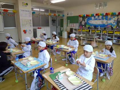 今日から給食が始まりました。1年生にとっては、9年間の義務教育の給食の1日目となりました。今日のメニューはミルクパン、牛乳、チキンナゲット、ワンタンスープ、アセロラジュレミックスでした。少し嫌いなものもあったのか、食べきらない児童もいました。