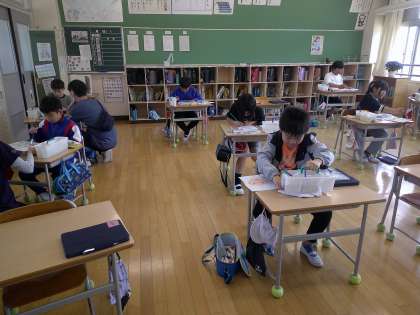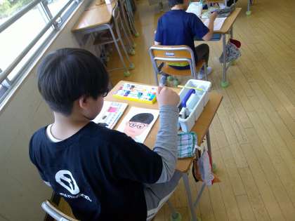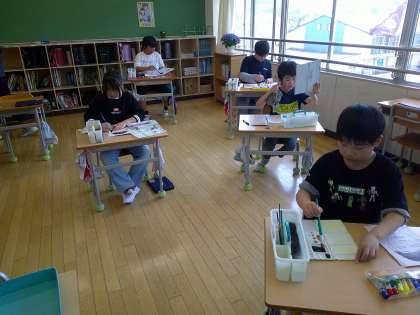 今日は自分の似顔絵を描きました。学級目標(掲示物)の周りに13人の似顔絵が入る予定です。先生からは1色だけではなく、色を組み合わせてくださいと指導がありました。仕上がりが楽しみです。