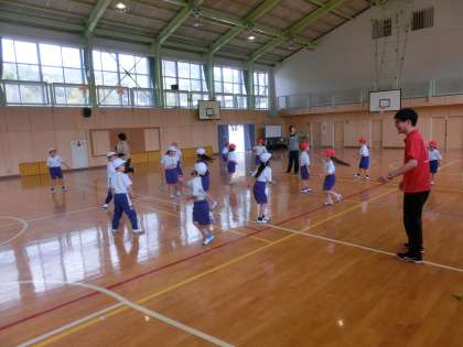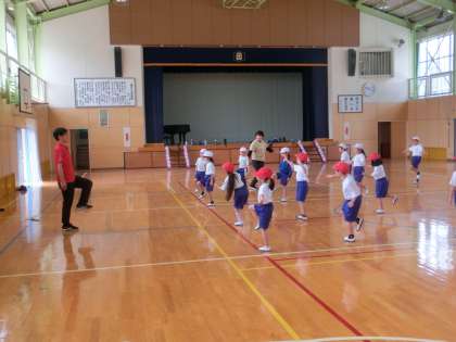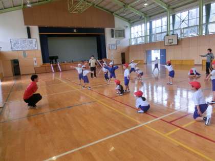 鬼石小学校では、体育の授業を低学年、中学年、高学年ごとに行っています。体育館をのぞいてみると、1・2年生が合同で体育をしていました。テーマは「体のバランス」です。片足でできるだけ動かずにバランスをとったり、片足を床についたままくるっと回ったりしました。ポイントは「バランスを崩して倒れないようにする」です。楽しみながら体のバランスを保とうとしていた1・2年生でした。