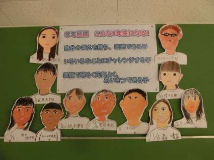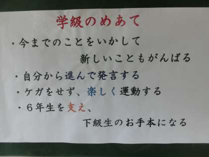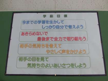 鬼石小学校では、各クラスで学級目標を決め、よりよい学校生活を送ろうと努力しています。毎日目標を意識しながら生活できるように、目標が教室に掲示されています。どのクラスも目標の達成を目指してがんばってほしいです。写真は上から順番に4・5・6年生の学級目標です。