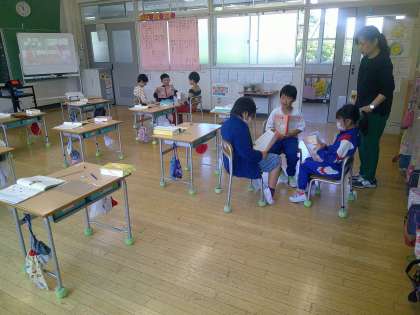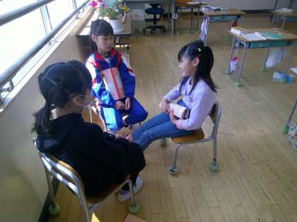話を聞いて、質問する学習をしています。今日は実際に発表する人と質問する人の役割を決めて、グループで話合いをしました。発表している児童、聞いている児童、質問している児童、全ての児童がうれしそうでした。