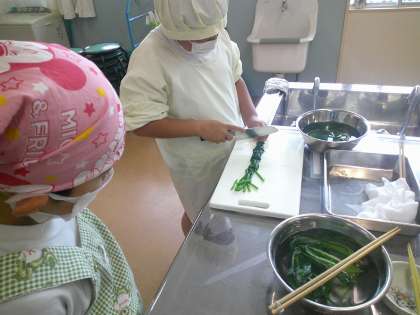 5月13日(月) 5年家庭科 公開日 2024/05/13 更新日 2024/05/13 できごと 今日は調理実習をしました。ほうれん草をゆでる学習でしたが、子ども達は意欲的に実習していました。包丁も上手に使って頼もしかったです。