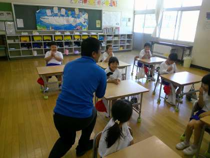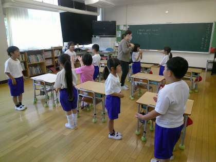 「What’s your name?」「My name is 〇〇」の練習をしました。最初はペアで練習、その後は音楽に合わせて、先生がマイクを向けた人が答えるゲームをしました。マイクを向けられると、恥ずかしそうに自分の名前を答える1年生でした。