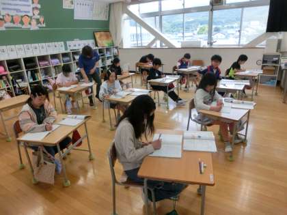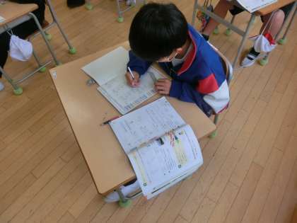 4年生の算数は、わり算の筆算を学習しました。めあては、「割られる数が3桁のいろいろな筆算をしよう」です。割られる数が3桁のわり算の筆算を解きながら、十の位や一の位に商として0が立つときは、筆算を省略できることに気付きました。わり算の筆算にも慣れてきたようで、スムーズに答えを求めることができるようになってきた4年生でした。