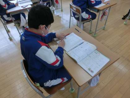6年生の算数は、「分数と整数のかけ算・わり算を考えよう」の学習をしました。めあては、「計算練習をして、マスターしよう」です。分数に整数をかけたり、わったりする計算の仕方が分かった6年生は、たくさんの問題を解きながら習熟を図っていきます。約分をうまく使いながら、正確に答えを求められるようになりました。