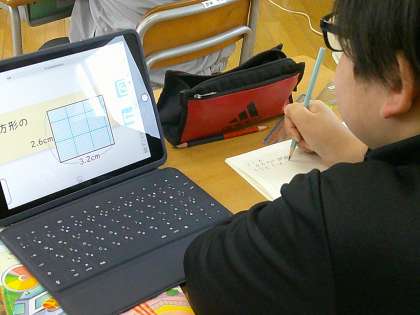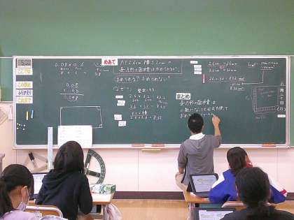 5月20日(月) 5年算数 公開日 2024/05/20 更新日 2024/05/20 できごと 長方形の面積を求めるとき、たてと横が小数でも面積を出せるのかを調べる学習でした。 小数でも計算できることを確かめた5年生、今度は公式どおりに計算していきましょう。