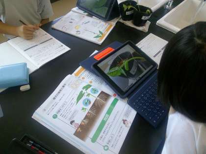 5月21日(火) 5年理科 公開日 2024/05/21 更新日 2024/05/21 できごと 2週間程前に種まきをした大豆は、既に発芽して大きくなってきました。今日のめあては「子葉は発芽するときにどのようなはたらきをしているのだろうか」でした。子葉や葉、茎などを観察しながら考えをまとめました。
