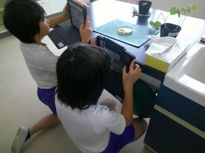 5月23日(木) 5年理科 公開日 2024/05/23 更新日 2024/05/23 できごと 植物の生長と発芽の学習をしています。発芽する前と後の種子をヨウ素液に浸して、種子の変化を観察しました。タブレットの写真に記録して、その反応が何かを考えていました。