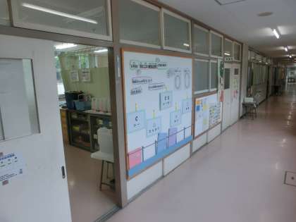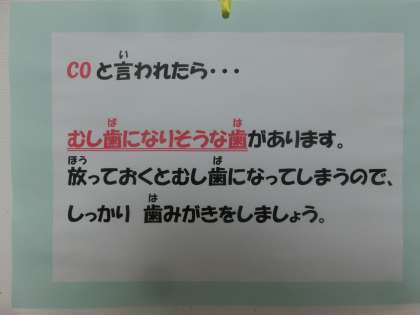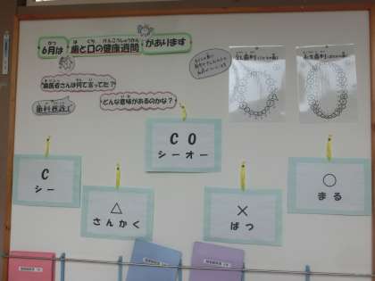 保健室前の廊下に行ってみると、月ごとに児童に関係の深い保健情報が紹介されています。6月に「歯と口の健康週間」があることから、歯科検診で歯医者さんが言っていた記号の意味について紹介しています。「COと言われたら、それはむし歯になりそうな歯があるということなので、しっかり歯を磨きましょう」との呼びかけがあります。児童の皆さんは、保健室の様々な保健情報を積極的に見て、自分の健康を守っていってほしいです。