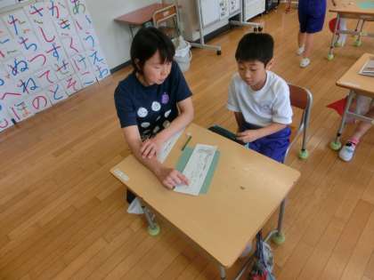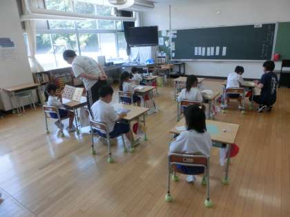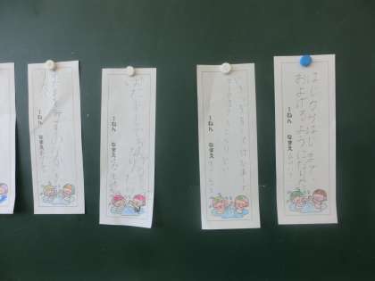 1年生は、これから始まる水泳学習の目標を考え、習いたてのひらがなを使ってカードに書きました。「あたまをみずのなかにいれてもぐりたい」「はじからはじまでおよげるようになりたい」様々な目標がありました。意欲的に学習に取り組み、目標を達成してほしいです。