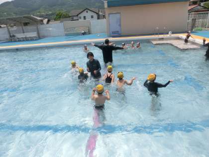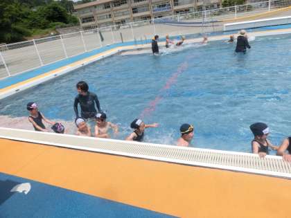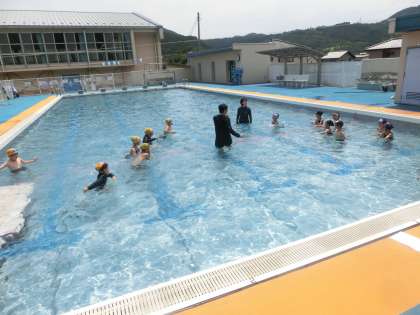 1・2年生の体育は、プールです。1年生にとっては初めての水泳学習となります。低学年での水泳学習では、水と友達となることが活動の中心となります。水を自分や友達にかけたり、プールの中をゆっくり歩いたり、時には走ったりと、とにかく水を使ってたくさん遊びました。最初は少し不安そうな1年生でしたが、段々慣れてくると積極的に楽しみながら活動していました。水とたくさん遊んで、水が大好きな友達になった1・2年生でした。