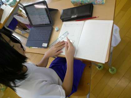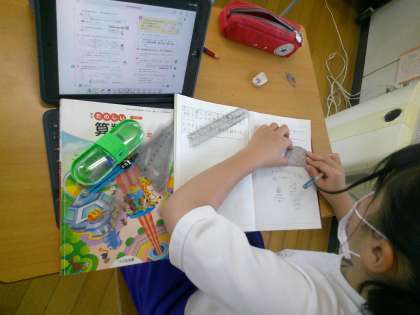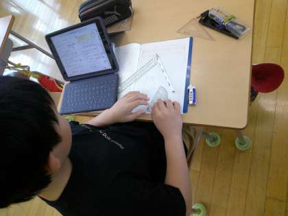 今日のめあては「重なり合う辺と角について調べよう」でした。最初に先生が指示した四角形を描きましたが、「ひさしぶりだ〜」と言いながら、上手に三角定規や分度器を用いて描いていました。