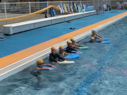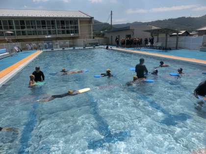 1・2年生の体育は、プールで水泳学習をしました。1年生もこれまでの学習で水にも慣れてきたようで、積極的に取り組んでいました。今日は、ビート板を使いながら、体を浮かせる練習をしました。何回も繰り返し練習して、体をうまく浮かせることができるようになりました。