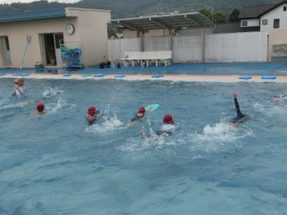 3・4年生の体育は、水泳です。ビート板を使いながら、体を浮かせることができるようになってきた3・4年生は、次に足のかきや手のかきの練習に取り組みます。だんだんできるようになり、自信を持った子どもはビート板を使わずに練習をします。「泳ぐ」にどんどん近づいています。