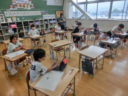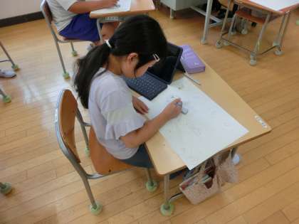4年生の図工は、ポスターコンクールに出品する作品のアイデアを考えました。下書きをしながら、構図やポスターに入れる文字などを考えます。最終的な作業は、夏休みの宿題として家庭で取り組みます。とてもよい内容のポスターができるのではと期待しています。