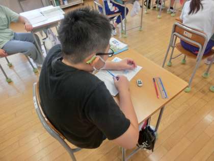 5年生の算数は、「角柱と円柱の体積」の学習をしました。単元のまとめとして、プレテストをしたり、たしかめの問題を解いたりしました。学んだことがきちんと定着するよう頑張っていた5年生でした。