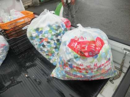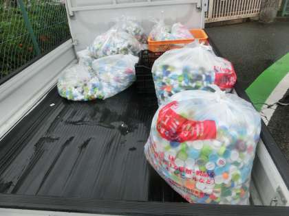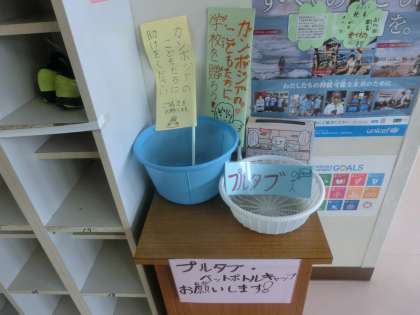 藤岡市ボランティアネットワークセンターウィズでは、リサイクル品の収集に取り組んでおり、鬼石小も協力しています。ペットボトルの蓋やアルミ缶のプルタブを回収し、リサイクル資源として活用しています。1学期に鬼石小で集めていたものをボランティアセンターウィズの方に回収に来ていただきました。これらはリサイクルされて、また生まれ変わるとともに、カンボジアに学校を建設する資金となります。「ちりも積もれば山となる」です。小さなことでも一つ一つ積み重ねていけば、とても大きな力になります。鬼石小では、これからもボランティアセンターウィズの活動に協力していきたいと思います。