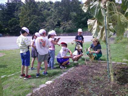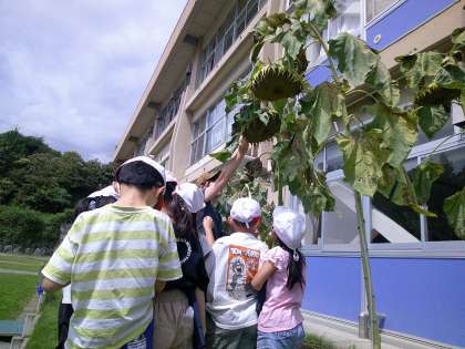 9月2日(月) 3年理科「実ができたよ」【進んで学ぶ子】 公開日 2024/09/02 更新日 2024/09/02 できごと 今日のめあては「植物の育っている様子をかんさつしよう」でした。1学期に植えた「ひまわり」「ほうせんか」「おくら」「ピーマン」の様子を外に観察に出た3年生。「わー、すごい」「こんな実ができている」など、驚きの声がでていました。