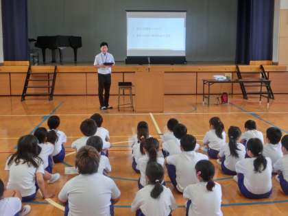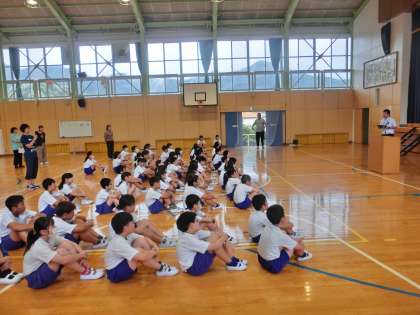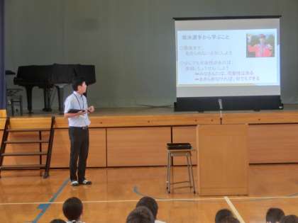 今日の朝の活動は、朝礼を行いました。校長先生からは、堀米雄斗選手についての話がありました。堀米選手は、パリオリンピック日本代表のスケートボード選手です。東京オリンピックで金メダルを獲得した堀米選手は、パリでも金メダルを狙っていました。しかし、最終演技前の順位は7位と本人が狙っているものではありませんでした。「今回は金メダルは無理だろう」と誰もが思う中、堀米選手だけはあきらめませんでした。最後の演技で誰よりも難しい技に挑戦し、見事その技を成功させ、大逆転となる2大会連続の金メダルとなりました。堀米選手のエピソードからあきらめないことの大切さを学びました。児童のみなさんも「もうだめだ」「きっとうまくいかない」とつい思ってしまうことがあるでしょう。そんな時は、堀米選手のことを思い出し、あきらめないで挑戦してほしいです。