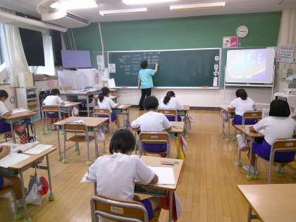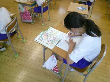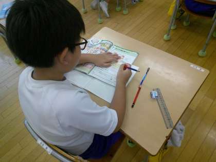 今日は「がい数」の学習の最初の時間でした。先生が教科書の例題を投げかけると、子どもたちはどんどん問題を進めたいと先生に訴え、先生から許可をもらうと意欲満々に答えを書いていました。意欲的に学習を進める4年生でした。