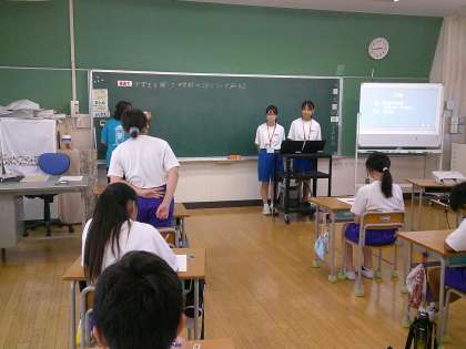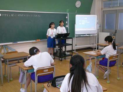 9月5日(木) 6年学活「中学校について」【進んで学ぶ子】 公開日 2024/09/05 更新日 2024/09/05 できごと 本日は、チャレンジウィークで来ている鬼中生に「中学校について」の話をしてもらいました。中学校の部活動や1年の行事などについて、詳しく話をしてもらったので、6年生も少し不安がなくなったようです。 近づいている中学生に向けて、少しずつ心の準備をしていきましょう。