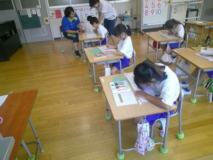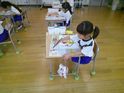 9月12日(木) 1年図工「えのぐをつかおう」【進んで学ぶ子】 公開日 2024/09/12 更新日 2024/09/12 できごと 今日は絵の具を使って、魚の絵の色塗りにチャレンジしました。絵の具のパレットや筆洗いバケツの使い方などを一から教えてもらいました。終わった後は、「見て、見て」と自信満々で、全員満足した表情になっていました。