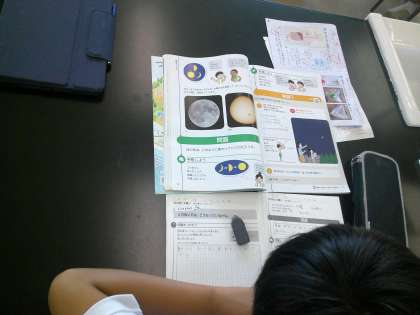 今日のめあては「月の形はどのように変わっていくのだろうか」でした。児童たちの予想では「1日ずつ丸くなり、満月になったら細くなり消えていく」「形がふくれて丸くなる。太陽の位置によって変わる」などの意見が出ていました。その後、今後の観察の計画を先生と話し合っていました。