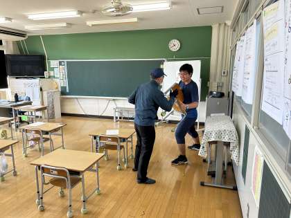 3校時は不審者対応の避難訓練を行いました。2年教室に不審者が侵入したという想定での訓練でした。不審者が侵入したことを他の教室に知らせるとともに、不審者から遠ざかるように逃げました。避難訓練後、振り返りをするとともに、防犯ブザーがきちんとなるか確認しました。不備があったものもあるので、家庭で確認し、いざというときに使えるようにしていただければと思います。