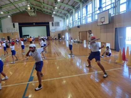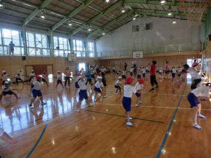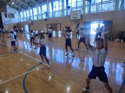 1校時の体育は、全校で運動会で踊る鬼小ソーランの練習を体育館で行いました。5・6年生が力強く踊る姿を1・2年生がしっかり見ながらまねをします。上級生も下級生が見ているので、手を抜くことができません。互いの相乗効果で踊りの質も高まり、感動を生む鬼小ソーランになるのではと期待しています。子供たち頑張っています。