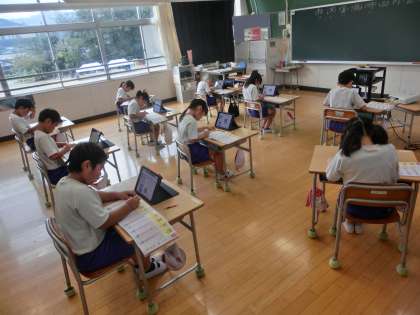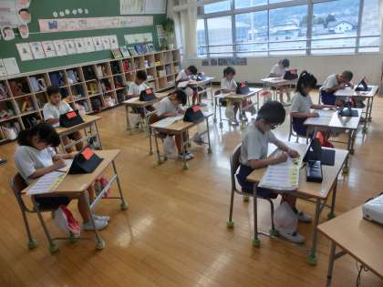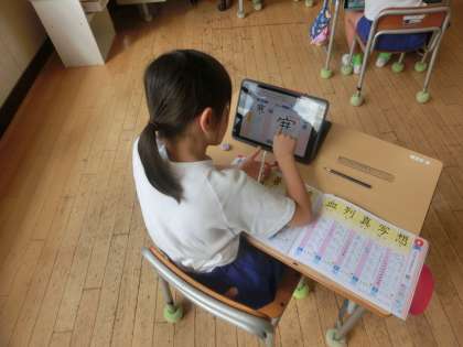 3年生の国語は、新出漢字の学習をしました。めあては「新しい漢字をおぼえよう」です。タブレットをうまく活用しながら、漢字の正しい形、筆順、漢字の意味、部首などを学習していきます。指で書いたり、漢字ドリルに鉛筆で書いたりしながら、習熟を図ります。子供たちも新しい漢字が書けるようになり、うれしそうです。しかも、とてもよい姿勢で書いていました。すばらしいです。