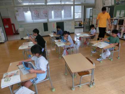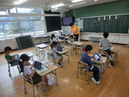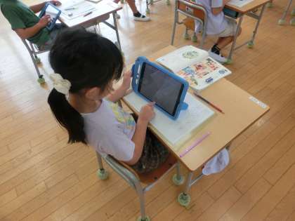 2年生の国語は、「漢字の広場」の学習をしました。めあては「「は」や「を」を使って文を作ろう」です。これまでに学習した漢字を用いて、「は」や「を」の使い方に注意しながら、短い文を作りました。自分が作った文章をタブレットを活用しながら友達と初回市合いました。
