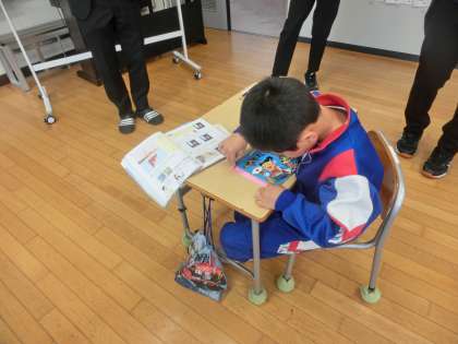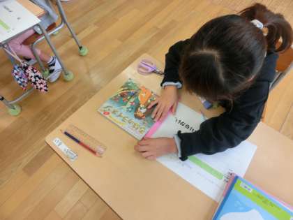1年生の算数は、「長さ比べ」の学習をしました。めあては「どうすれば比べられるか」です。これまでの学習で「端を揃える」「ぴんと伸ばす」「折り曲げる」などをすると2つの物の長さを比べられることを発見した1年生は、問題「絵本の縦と横の長さは、どちらが長いでしょう。」に挑戦します。本は折り曲げることができないので、これまでの方法では比べられません。新しい方法を考えます。「細い紙に印をつけるとよいのでは?」という友達の考えをもとに比べてみました。細い紙を使うとうまく長さ比べができた1年生は、他の物の長さ比べをします。大きな段ボールと教室の入り口の長さを比べます。それぞれの長さをテープで測り比べます。「入り口の方が長いから、段ボールを教室の外に出せるぞ。」テープを使うと、折れない物や動かせない物の長さを比べられることに気付いた1年生でした。