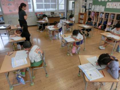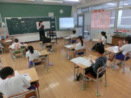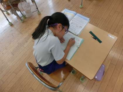 3年生の算数は、「小数」の学習をしました。めあては「小数の仕組みを調べよう」です。「2.6」という小数は1を2こ、0.1を6こ合わせた数だと分かった2年生は、他の小数でも確かめてみます。活動を通して、小数は1を〇こ、0.1を〇こ合わせた数と説明できることに気付いた3年生でした。