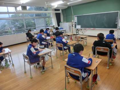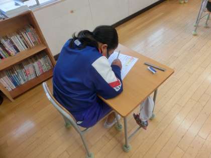 「話す聞くテスト」に取り組みました。まずは、音声を聞きながら、大切なことをメモしていきます。次に「落とし物が多いところはどこか?」「どんな落とし物が多いかを調べた結果、どんな内容を呼びかけるといいという意見を出したか?」「山口さんの意見の述べ方についてよかった点は何か?」といった問題に答えていきます。「先生の話をしっかり聞く」など、普段の生活においても、「話を聞く」ということは毎日していますが、なかなか「正しく聞く」というのが難しいようです。問題を解きながら、悩んでいた5年生でした。