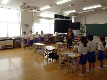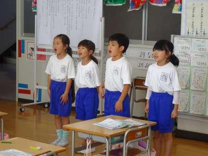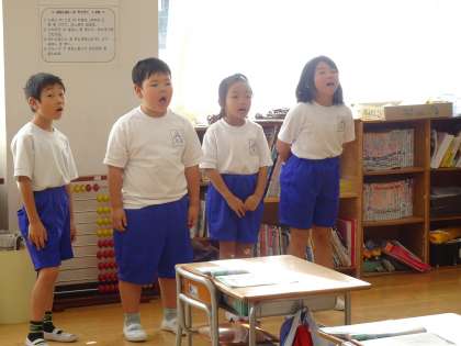 今日のめあては「互いの声を聞きながら、よびかけあって歌おう」でした。曲は「やまびこごっこ」で、向かい合って歌い合いました。