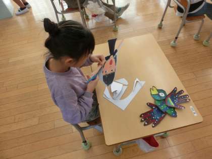 3年生の校内図画展の作品製作も終盤となりました。3年生は、「鳥」と「自分」が柱となる作品です。まず、作った「鳥」と「自分」を切り取ります。次に、切り取った「鳥」と「自分」を画用紙のどこに貼るか考えます。完成までもうすぐです。