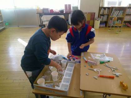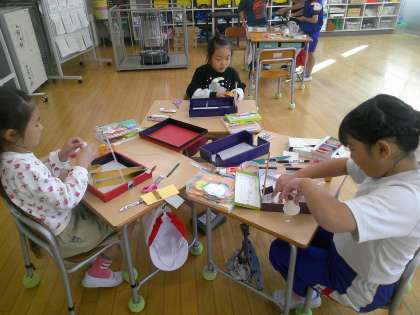 11月22日(金) 1年生活「きせつとなかよし」【進んで学ぶ子】 公開日 2024/11/22 更新日 2024/11/22 できごと 今日のめあては「あきのたからもので、たのしめるものをつくろう」でした。今日は、「はこねらい」「めいろ」「オナモミダーツ」の3つを作成。途中で、先生が「楽しめるために、どのようにしたらいい?」などと問いを与えると、児童たちは工夫を加えながら作業を続けました。