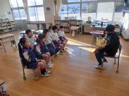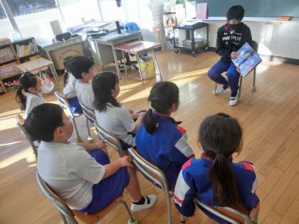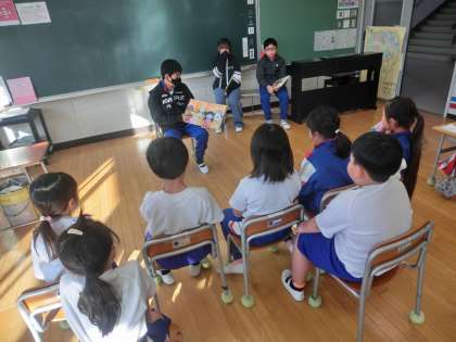 6年生が「鬼石小のために」という視点で活動しているのが、「鬼石小にこにこプロジェクト」です。朝の活動の時に、1年教室へ行ってみると、6年生が1年生に対して読み聞かせをしていました。読み聞かせもこの「鬼石小にこにこプロジェクト」の一つです。1年生は楽しそうに6年生が読む絵本を聞いています。6年生は物語の様子が伝わるように一生懸命読みます。1年生を喜ばせようと頑張っていた6年生でした。