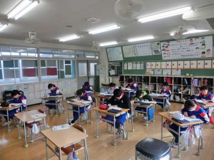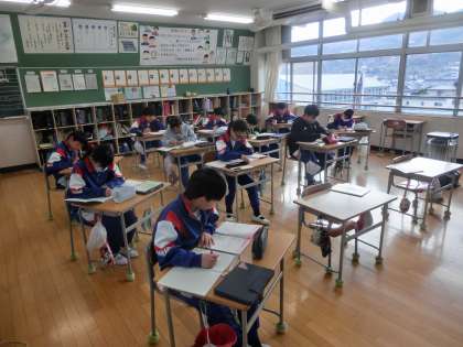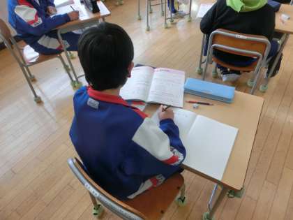 5年生の算数は、「割合」を学習しました。問題集の問題をたくさん解きながら、これまでに学んだことの習熟を図ります。ひたすら問題を解いていたので、疲れたことと思います。しかし、授業が終わったときには、「〇〇まで問題ができた」「□□が難しかったけど、何とか解けた」など、友達と会話していました。その表情から充実感が伝わってきました。頑張りました。