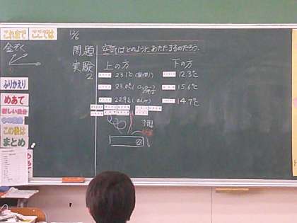 空気のあたたまり方について、せんこうと温度計を使って実験しました。予想の段階から上の方があたたまると予想していた児童が多かったのですが、実際に温度計を使うと客観性が出てきて、しっかり結果をつかむことができました。