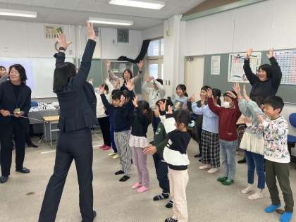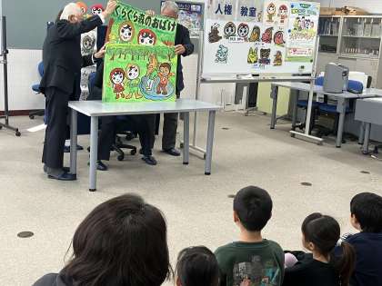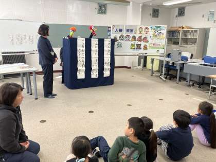 12月10日(火) 1・2年人権教室【思いやりのある子】 公開日 2024/12/10 更新日 2024/12/10 できごと 今日は人権擁護委員の方をお招きし、人権教室を開催しました。2時間目は1・2年生を対象に、紙芝居「ぐらぐらもりのおばけ」を使って指導していただきました。児童たちは、「思いやり」「やさしさ」「違いをみとめよう」などのキーワードをもとに、人権について深く考えてくれました。最後は、人権ソングを振り付けで歌って終了でした。貴重な時間をありがとうございました。