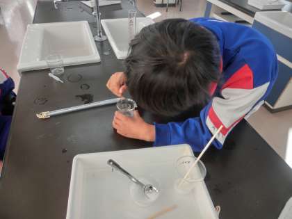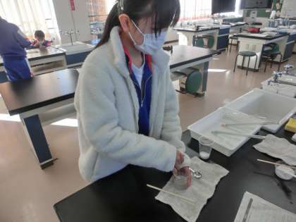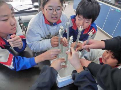 「もののとけ方」を学習している5年生は実験です。問題は、「水の量や温度によって物の溶ける量は変わるのだろうか?」です。水の中に食塩やミョウバンを入れて溶かしていきます。また、水の量を増やしたり、水の温度を温めたりしながら溶かしていきます。水の量や温度によって物の溶ける量が変わるのか確かめます。「溶けた」「溶けないなあ」結果に驚きながら物を溶かす実験に主体的に取り組む5年生でした。