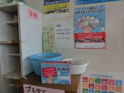 児童会が中心になって呼びかけていた「書き損じはがきの回収」が今日から始まりました。回収期間は1月24日(金)までです。集められた書き損じはがきは、換金され、アジアの国々に学校を作ることなどに使われます。年賀状などの書き損じはがきが家庭にありましたら、ご協力をお願いします。