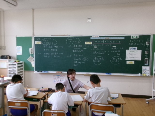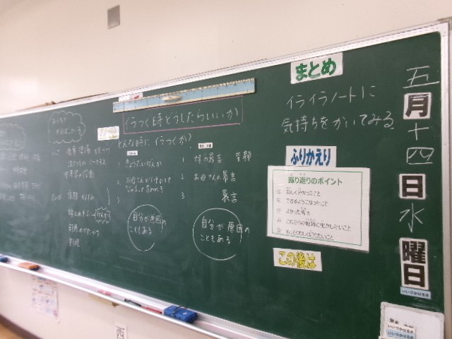 「イライラにた時どうしたらいいか」について考えていました。イライラすることを振り返り、「イライラノート」に気持ちを書いてみました。気持ちを書くと「すっきりした」と、自分の気持ちを整理することができました。この後はどうしたらよいかを考えると、「謝りたいな」と進んで行動しようとしていました。