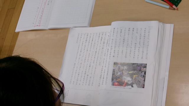 4年生の代表的な説明文の教材「アップとルーズで考える」。今日は、本文の1~8段落が「はじめ・中・終わり」のどこに当たるのかを考えました。「6・7段落は終わりだと思う」と最後まで主張した児童もいました。