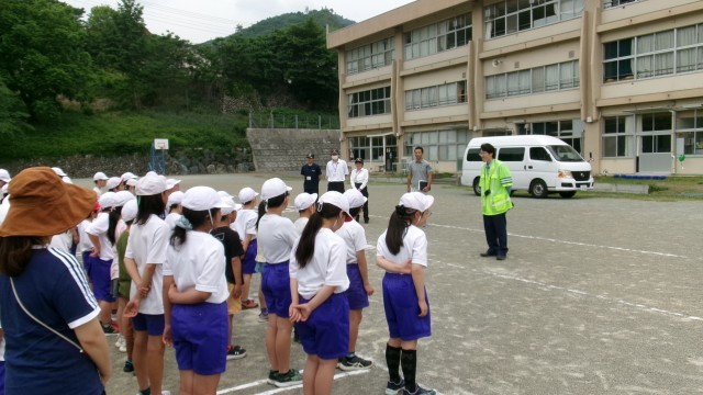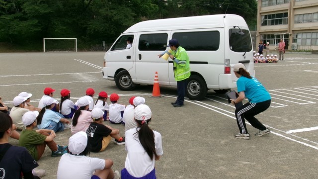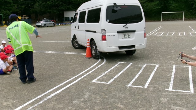 今日は藤岡警察署、藤岡市地域安全課の方をお招きし、交通安全教室を実施しました。内輪差実験では、車の前輪が通過しても後輪が内側を通ることを教えていただきました。また、衝突実験では、20キロと40キロのスピードの車にダミー人形がぶつかりその衝撃を知ってもらいました。さらに、1~3年生には、道路の渡り方を指導していただきました。
