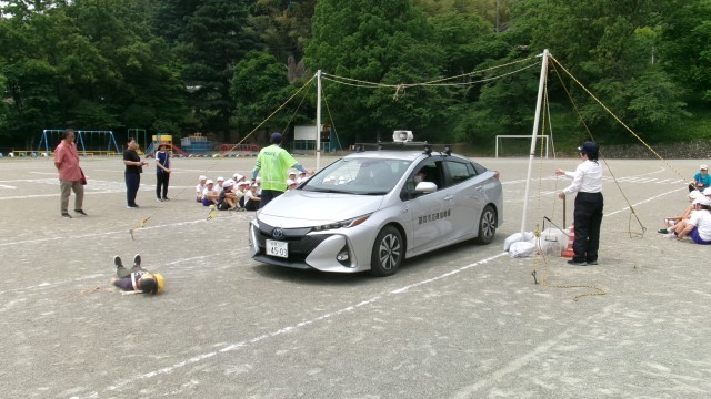 今日は藤岡警察署、藤岡市地域安全課の方をお招きし、交通安全教室を実施しました。内輪差実験では、車の前輪が通過しても後輪が内側を通ることを教えていただきました。また、衝突実験では、20キロと40キロのスピードの車にダミー人形がぶつかりその衝撃を知ってもらいました。さらに、1~3年生には、道路の渡り方を指導していただきました。
