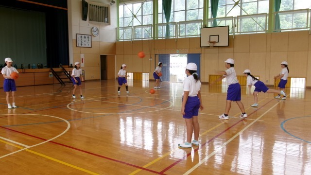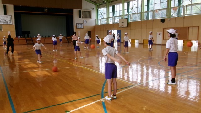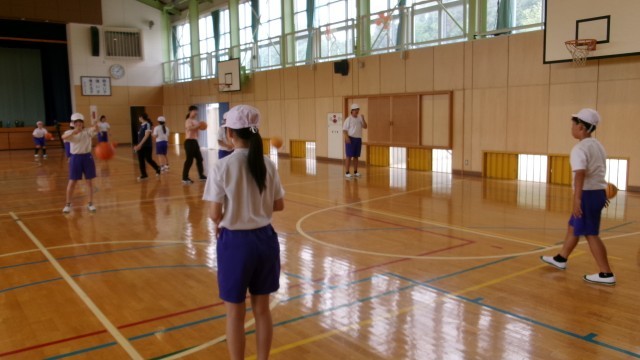 今日はバスケットボールに挑戦しました。ドリブル、パスの練習からスタートしました。なかなか、パスが上手にできない児童に、先生は身振りやお手本の児童を使って、足・体全体を使うことをアドバイスしました。この少しのアドバイスが大切だと思います。