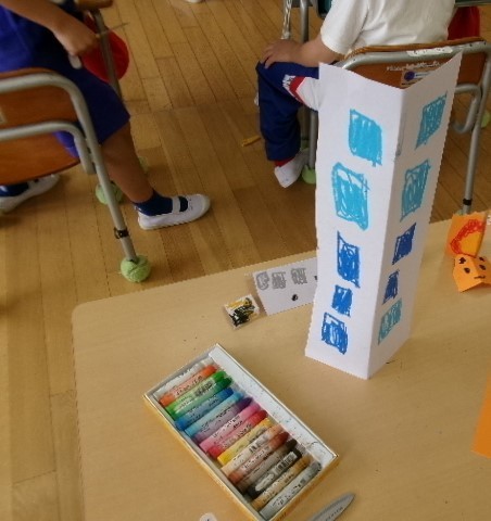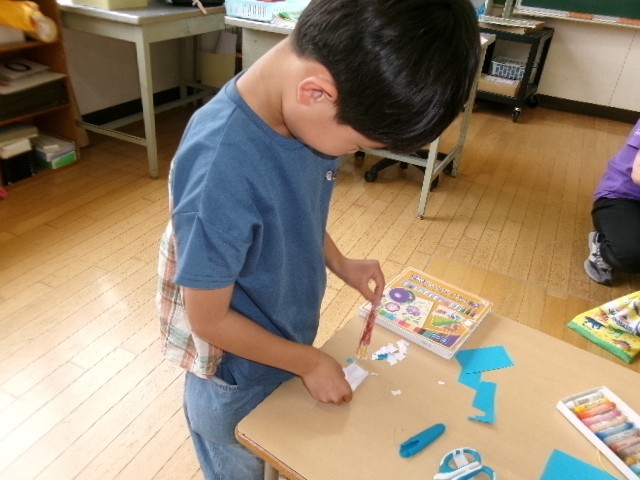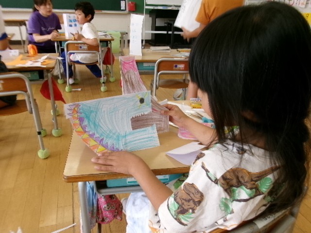 1年生は紙を折ったり切ったり立てたりして形をつくっていました。自分の作りたいものを工夫しながら形にしていました。牙のギザギザを工夫したり、建物を作ったりしていました。紙を切って作ったちりとりとほうきで、紙くずを片付けるなどアイディアを膨らませて楽しんで活動していました。